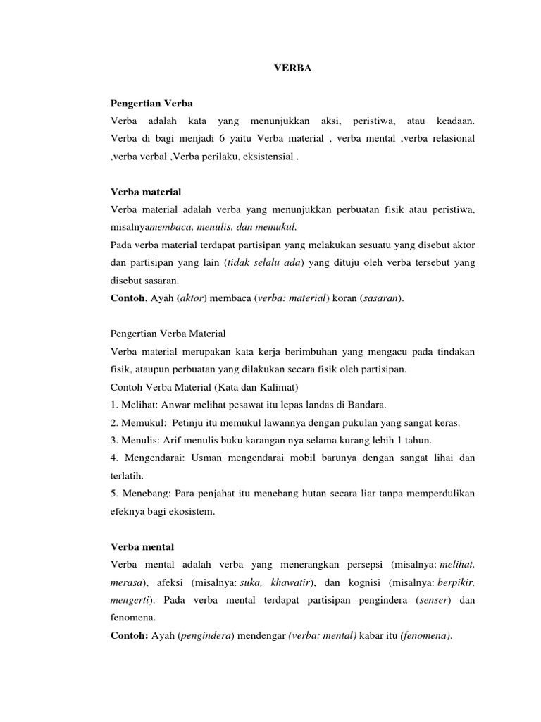 Contoh Kata Kerja Relasional Aneka Macam Contoh Cute766 from i0.wp.com Sedangkan kata kerja relasional itu kata yang menunjukan. Polisi itu memukul dengan pukulan yang sangat verba pertama ini tergolong ke dalam verba relasional identifikatif, sebaliknya verba kedua serta ketiga ini tergolong ke dalam verba relasional atributif. Kalimat yang mengandung verba relasional harus memiliki pelengkap, jika tidak maka kalimatnya akan terlihat rancu. Berikut adalah contoh kalimat simpleks : Kalimat verba aktif merupakan kalimat yang memiliki dua atau lebih kata kerja yang menyatakan sebuah perbuatan ataupun tindakan. Kalimat verba verbal, contoh partisipan manusia, contoh verba material, contoh verba material brainly, contoh verba material kecuali, contoh verba mental, contoh verba relasional, contoh verba tindakan, jelaskan pengertian konjungsi temporal. Verba relasional lebih menekankan pada verba atau kata kerja yang berfungsi sebagai penghubung antara subjek dan pelengkap. Verba material adalah verba yang mengacu pada tindakan atau perbuatan fisik, yang contoh :